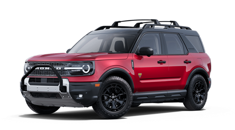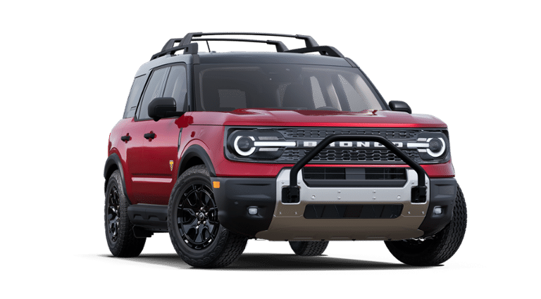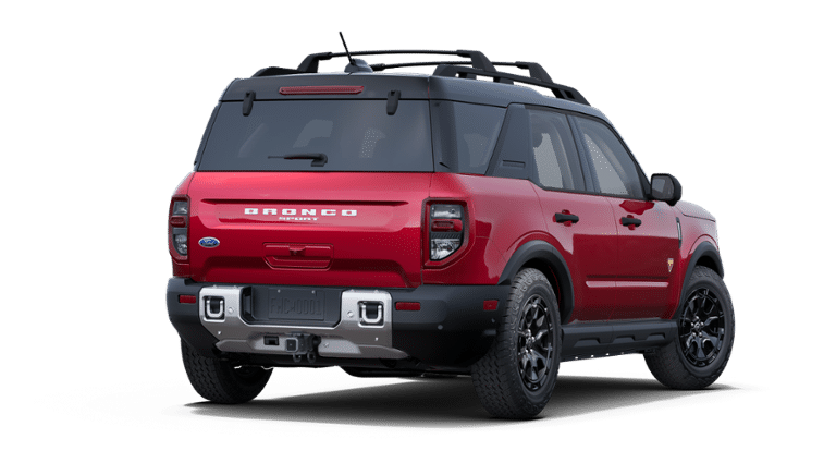 - Conquer any terrain in style with the 2025 Ford Bronco Sport Badlands, finished in striking Ruby Red Metallic. This rugged 4x4 is powered by a 2.0L EcoBoost engine paired with an 8-speed automatic transmission, delivering confident performance both on and off the road. Inside, youll find a comfortable and durable Dark Space Gray leather-trimmed interior with heated, power-adjustable front seats and a premium-wrapped heated steering wheel. Built for adventure, the Bronco Sport Badlands features the Sasquatch Package with 17-inch black-painted aluminum wheels, all-terrain tires, a bash plate, steel-plated front bumper, and twin-clutch rear drive unit with a seven-mode Terrain Management System, including Trail Control with one-pedal driving. The Badlands Tech Package adds enhanced connectivity with SYNC 4 and a large 13.2" touchscreen, plus intelligent features like Ford Co-Pilot360 Assist 2.0 and a 110V outlet. Additional amenities include a power moonroof, roof-rail crossbars, cargo management system, rubberized flooring throughout, and MOLLE strap zipper pockets. This capable SUV is adventure-ready with standard LED lighting, front recovery hooks, a digital instrument cluster, and under-seat storage. The 2025 Bronco Sport Badlands blends refined comfort with true off-road capability, making it the ultimate companion for outdoor exploration.