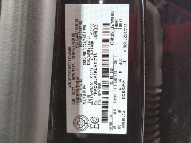 2024 Ford Escape Platinum AWD! AWD! 4D Sport Utility Agate Black Metallic AWD Escape Platinum AWD!, 4D Sport Utility, EcoBoost 2.0L I4 GTDi DOHC Turbocharged VCT, 8-Speed Automatic, AWD, Agate Black Metallic, Ebony Activex Trim Seats Leather, 6 Speakers, AM/FM radio: SiriusXM, Automatic temperature control, Brake assist, Electronic Stability Control, Equipment Group 601A, Exterior Parking Camera Rear, Four wheel independent suspension, Front fog lights, Fully automatic headlights, Memory seat, Navigation system: Connected Navigation, Panic alarm, Pedestrian Alert Sounder, Power driver seat, Power Liftgate, Security system, Speed control, SYNC 4 w/Enhanced Voice Recognition, Traction control.
